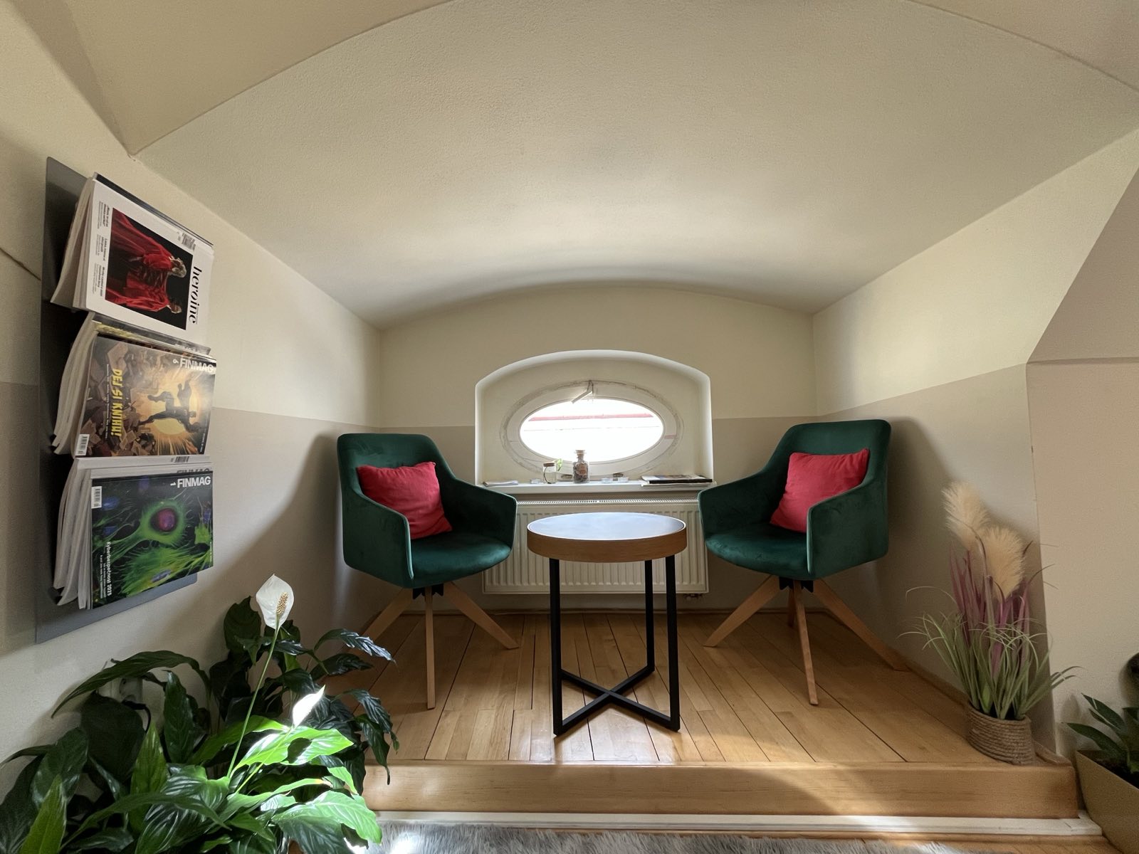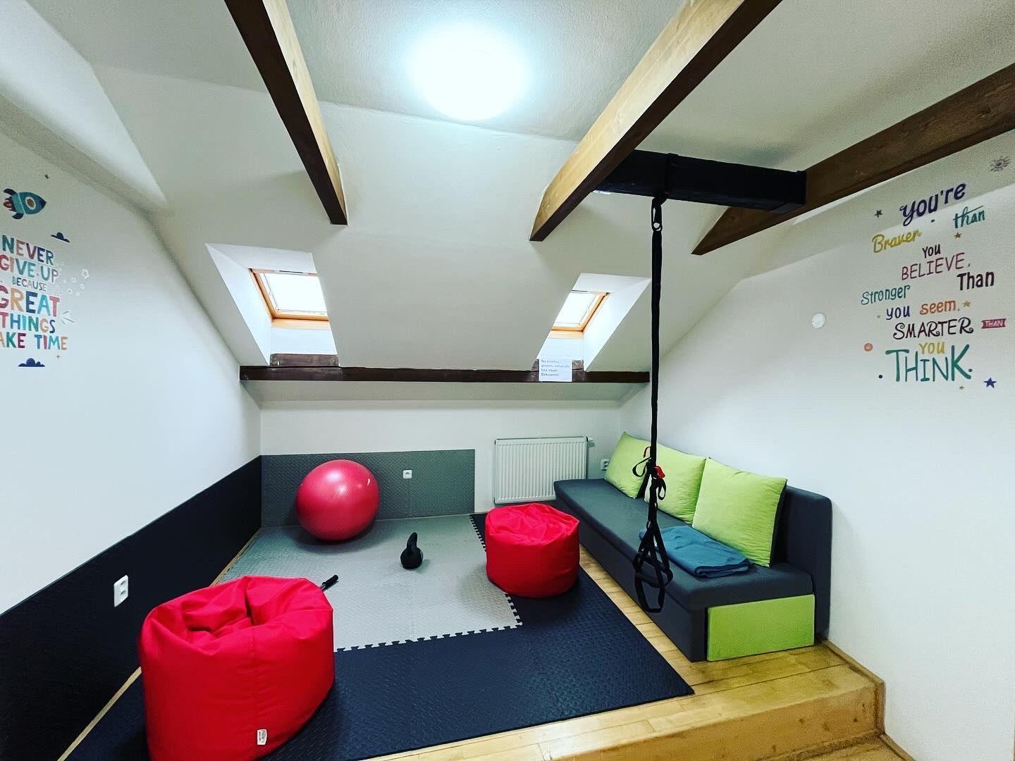 Kávovar. Zasedací místnost pro meetingy i školení. Relaxační kout s měkčenou podlahou a posilovacím nářadím