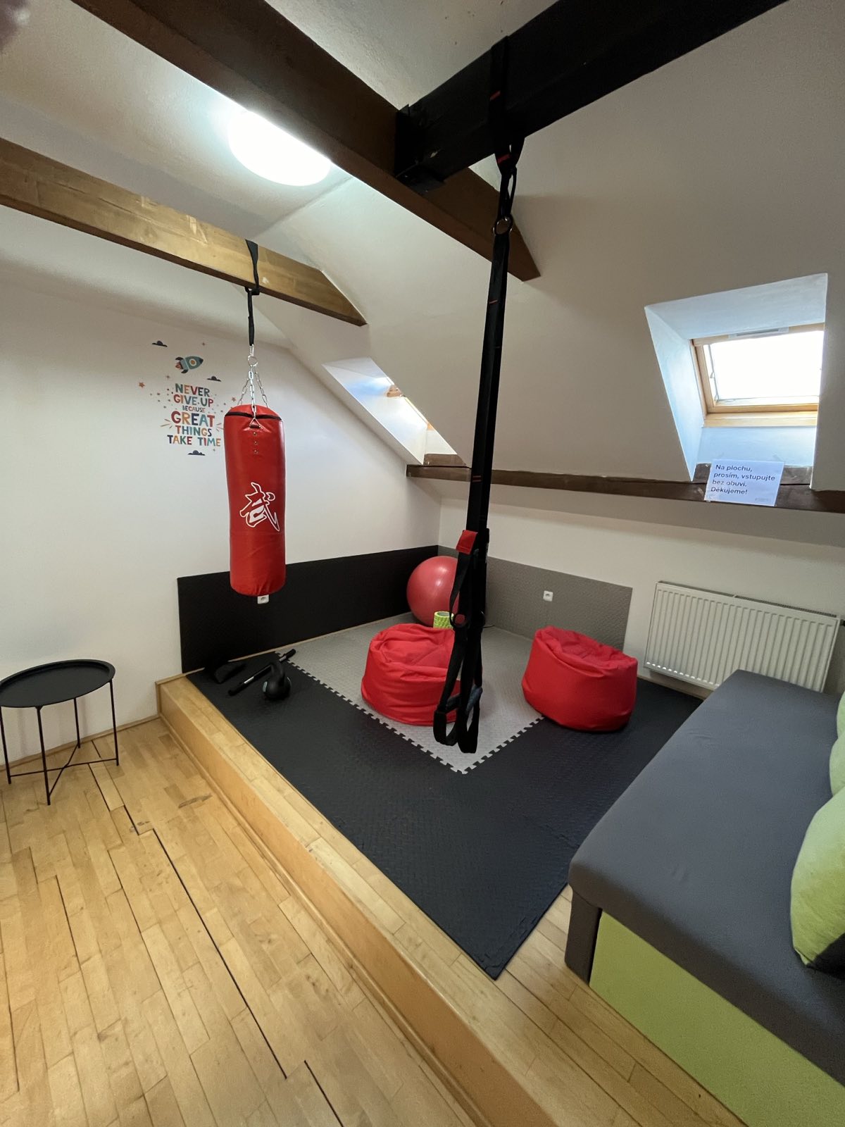 Prostor určený pro odpočinek během pracovního dne. Místnost je vybavena měkčenou podlahou, sedacími vaky, gymnastickými pomůckami, TRX závěsným systémem a dalším vybavením pro regeneraci těla i mysli.