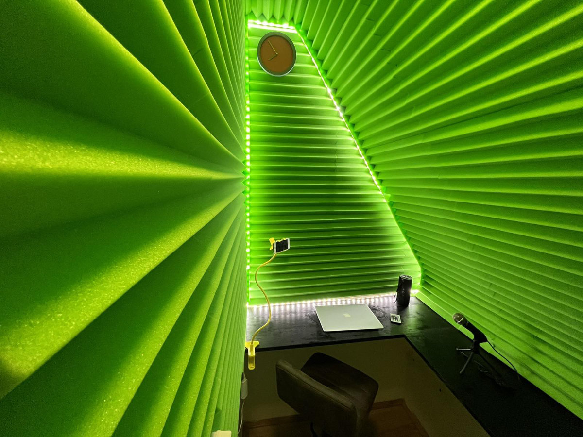 Akusticky izolovaná místnost ideální pro online schůzky, nahrávání podcastů, telefonáty nebo jakoukoli práci vyžadující klid a soustředění. Poskytuje zázemí bez rušení okolí a okolím.